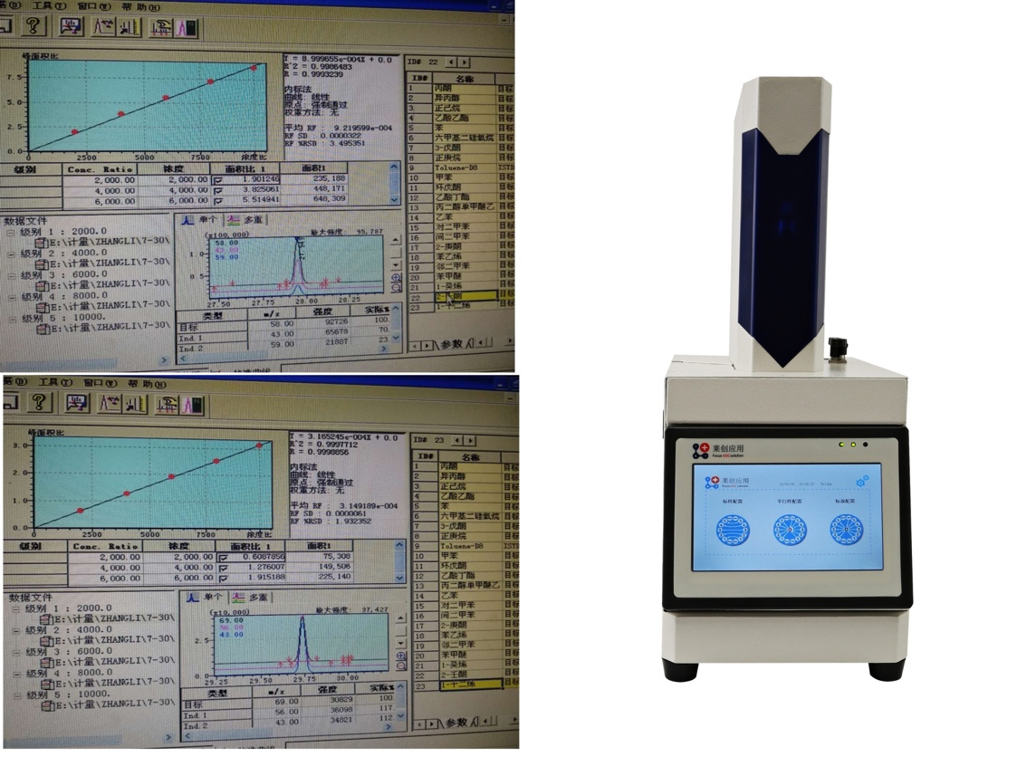 將已老化的 Tenax TA 吸附管,放置于熱脫附標樣制備儀中,設定相關參數,正己烷、苯及十六烷等 22 種混合標準溶液濃度:25ng/μL-1000ng/μL,進樣體積為 1μL,吹掃時間:2min,經 GC-FID 測試,實驗結果表明,采用ASP660 熱脫附標樣制備儀進行標準系列管制備,各個化合物獲得良好的線性關系 R2≥0.999(見圖 1),滿足相關法規及實驗要求。